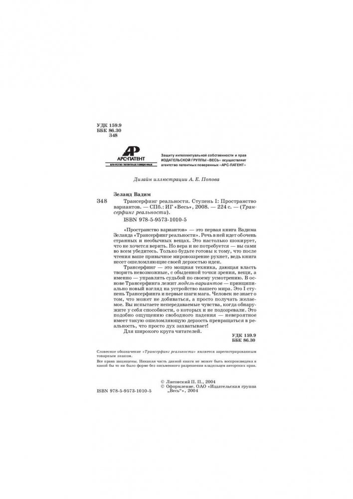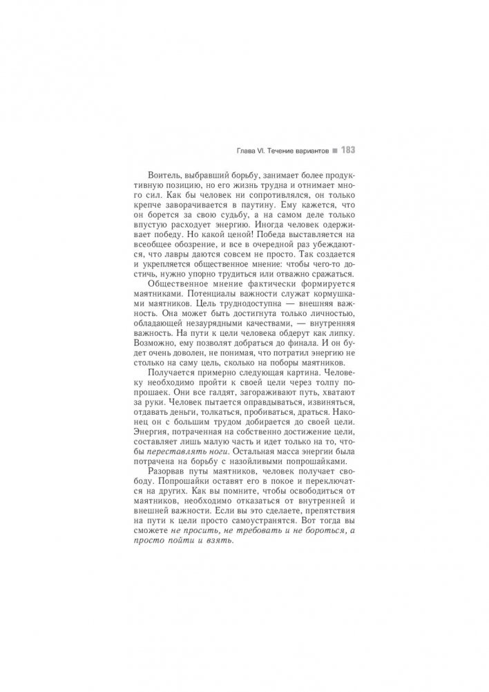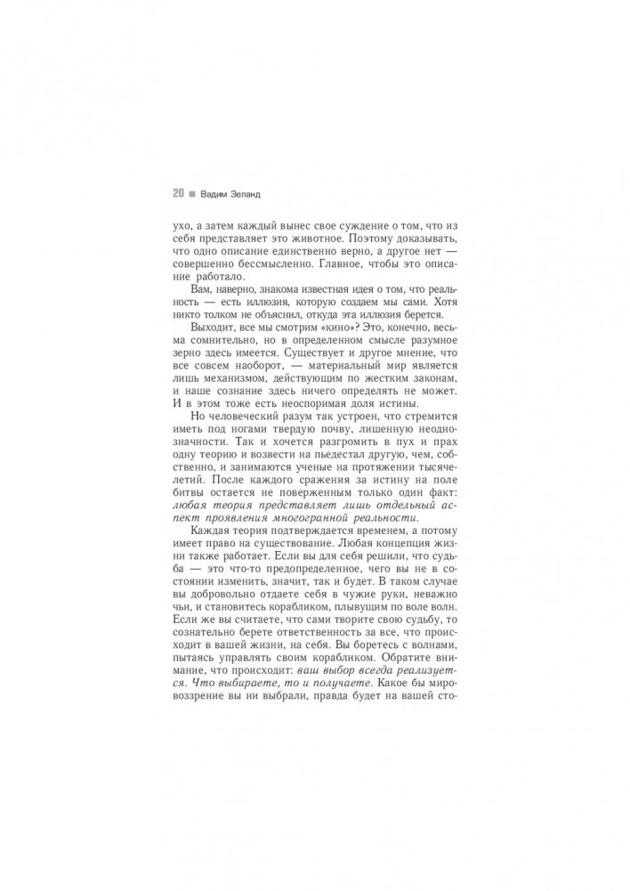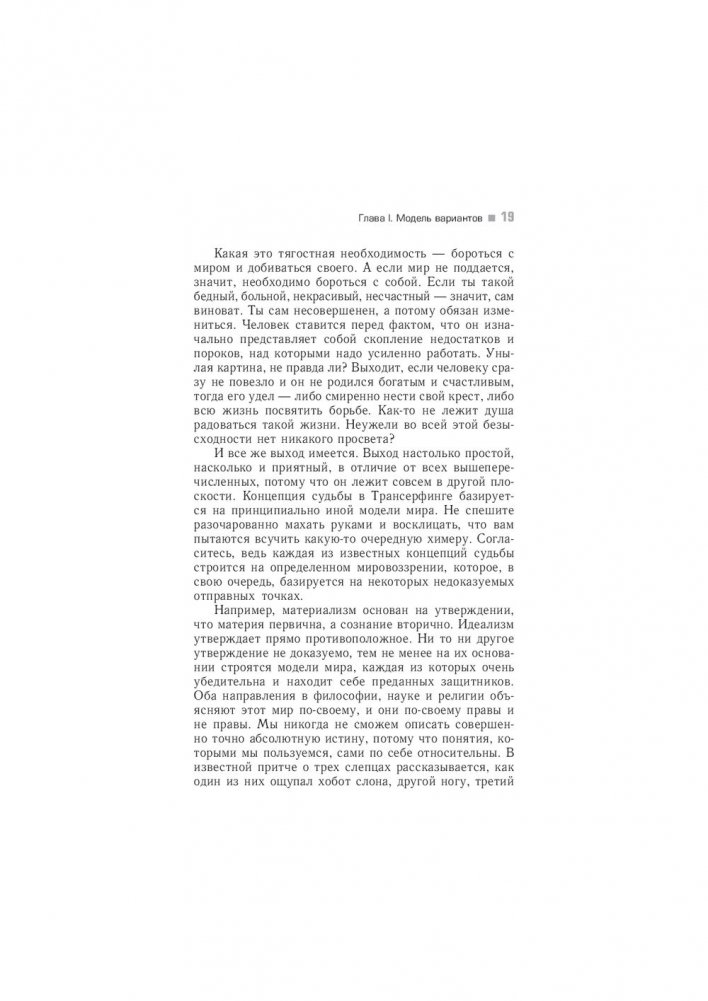В основе Трансерфинга лежит модель вариантов – принципиально новый взгляд на устройство нашего мира. Это I ступень Трансерфинга и первые шаги мага. Человек не знает о том, что может не добиваться, а просто получить желаемое. Метафоры "синяя птица" и "колесо фортуны" имеют под собой вполне материальную основу. Течение вариантов – это роскошный подарок для разума, о котором вы даже не подозревали… Без иллюстраций. Бумага офсетная.