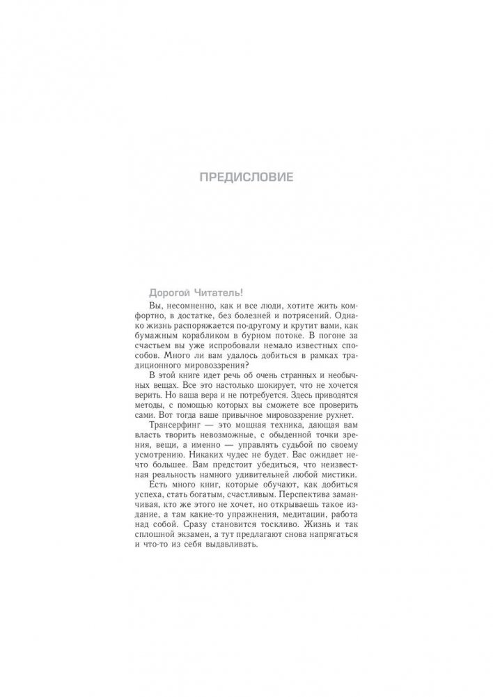 Трансерфинг – это мощная техника, дающая власть творить невозможные с обыденной точки зрения вещи, а именно – управлять судьбой по своему усмотрению. Никаких чудес не будет. Вас ожидает нечто большее – незнакомая реальность намного удивительней любой мистики. Вы испытаете непередаваемые чувства, когда обнаружите у себя способности, о которых и не подозревали. Это подобно ощущению свободного падения – невероятное имеет такую ошеломляющую дерзость превращаться в реальность, что просто дух захватывает!
