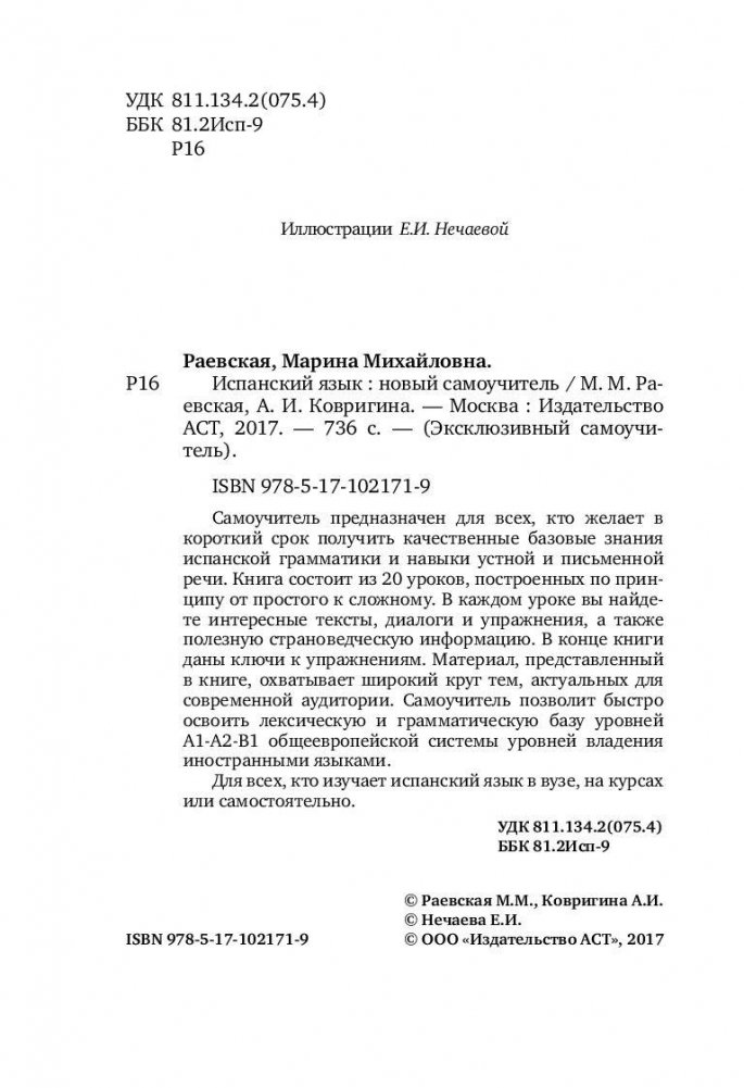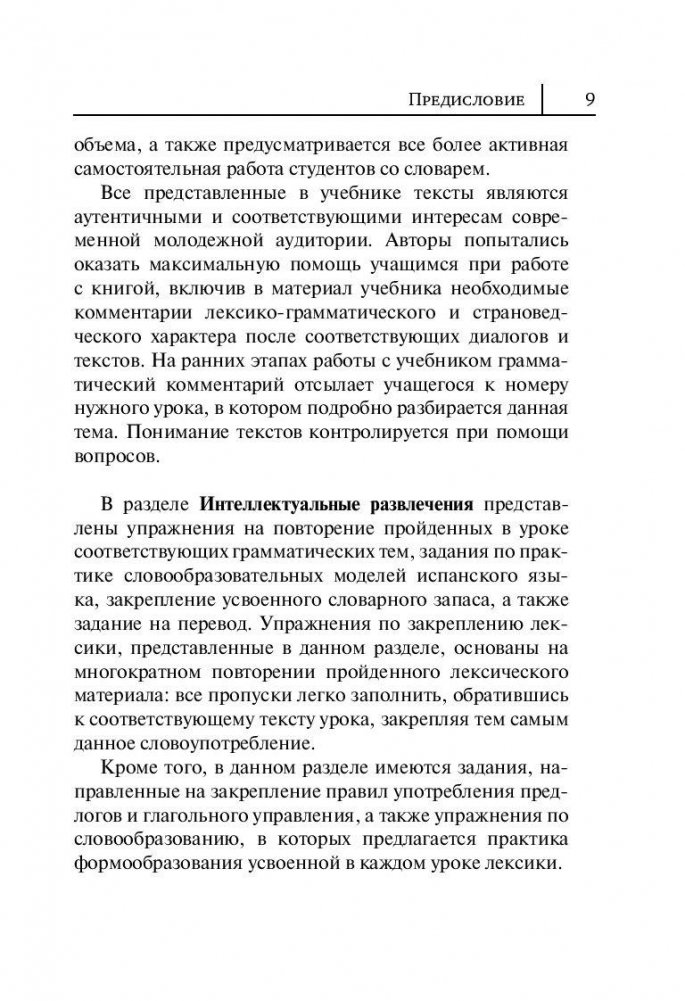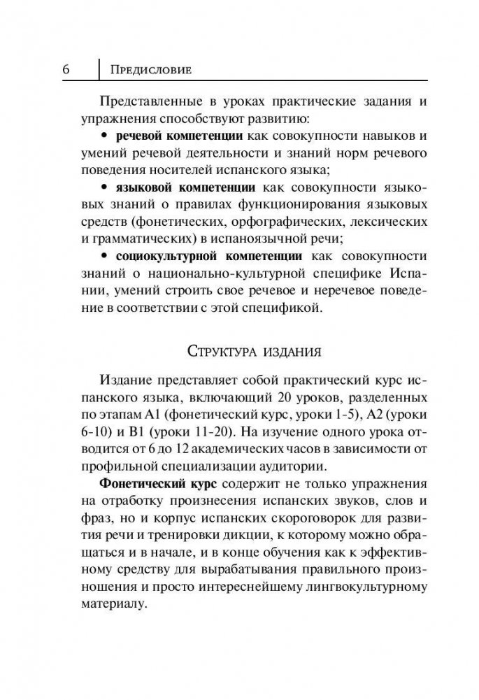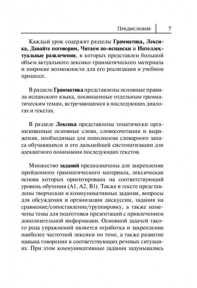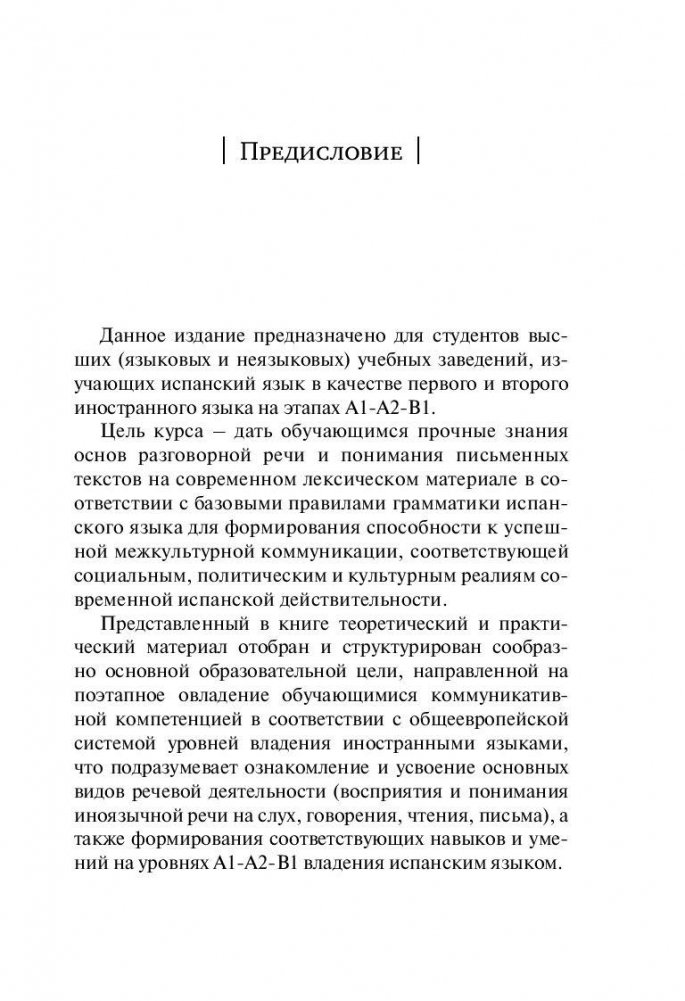 Самоучитель предназначен для всех, кто желает в короткий срок получить качественные базовые знания испанской грамматики и навыки устной и письменной речи. Книга состоит из 20 уроков, построенных по принципу от простого к сложному. В каждом уроке вы найдете интересные тексты, диалоги и упражнения, а также полезную страноведческую информацию. В конце книги даны ключи к упражнениям. Материал, представленный в книге, охватывает широкий круг тем, актуальных для современной аудитории. Самоучитель позволит быстро освоить лексическую и грамматическую базу уровней A1-A2-B-1 общеевропейской системы уровней владения иностранными языками. Для всех, кто изучает испанский язык в вузе, на курсах или самостоятельно.