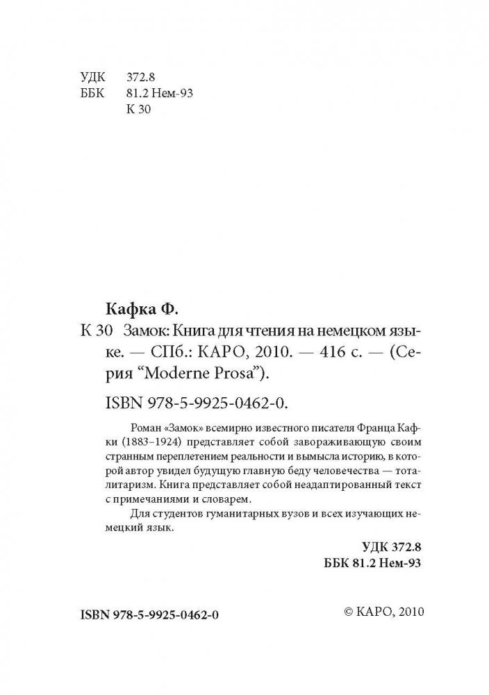 Франц Кафка (1883-1924) - один из крупнейших немецкоязычных писателей XX века. Его произведения, пронизанные абсурдом и страхом перед внешним миром и высшим авторитетом и способные пробуждать в читателе соответствующие тревожные чувства, - явление уникальное в мировой литературе. При жизни Кафка опубликовал всего четыре сборника рассказов, составивших очень малую долю его работ. Перед смертью он поручил своему другу и литературному душеприказчику Максу Броду сжечь без исключения всё им написанное, но Макс Брод не подчинился воле покойного и, таким образом, главные его творения - романы «Америка» (1911-1916), «Процесс» (1914-1918) и «Замок» (1921-1922), в разной степени незавершенные, увидели свет уже после смерти автора. Предлагаем вниманию читателей неадаптированный текст романа Ф. Кафки «Замок», снабженный комментариями и словарем.