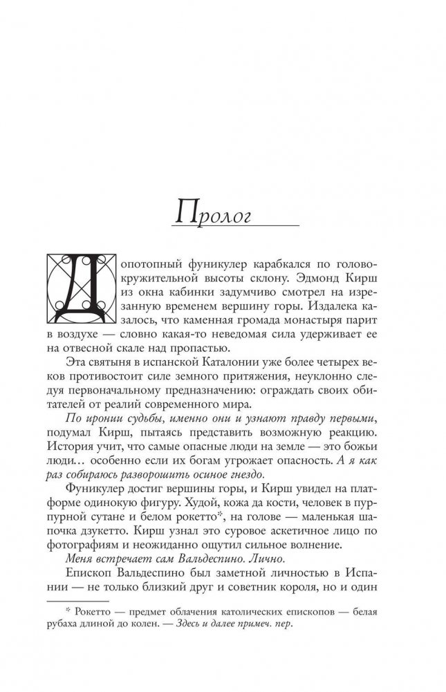 Роберт Лэнгдон прибывает в музей Гуггенхайма в Бильбао по приглашению друга и бывшего студента Эдмонда Кирша. Миллиардер и компьютерный гуру, он известен своими удивительными открытиями и предсказаниями. И этим вечером Кирш собирается "перевернуть все современные научные представления о мире", дав ответ на два главных вопроса, волнующих человечество на протяжении всей истории: Откуда мы? Что нас ждет? Однако прежде чем Эдмонд успевает сделать заявление, роскошный прием превращается в хаос. Лэнгдону и директору музея, красавице Амбре Видаль, чудом удается бежать. Теперь их путь лежит в Барселону, где Кирш оставил для своего учителя закодированный ключ к тайне, способной потрясти сами основы представлений человечества о себе. Тайне, которая была веками похоронена во тьме забвения. Тайне, которой, возможно, лучше бы никогда не увидеть света, — по крайней мере, так считают те, кто преследует Лэнгдона и Видаль и готов на все, чтобы помешать им раскрыть истину.