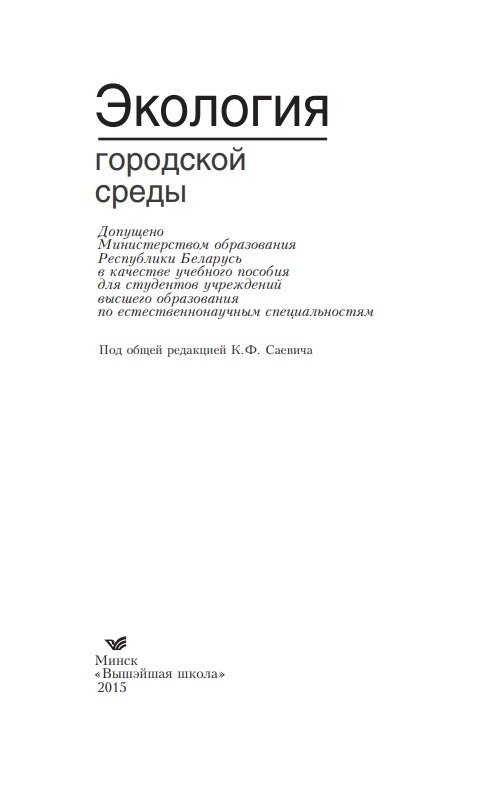 Для студентов естественнонаучных специальностей вузов. Будет полезно преподавателям и учащимся ССУЗов, работников системы повышения квалификации, специалистов городского хозяйства, проектных организаций, служб охраны окружающей среды организаций, предприятий и учреждений.